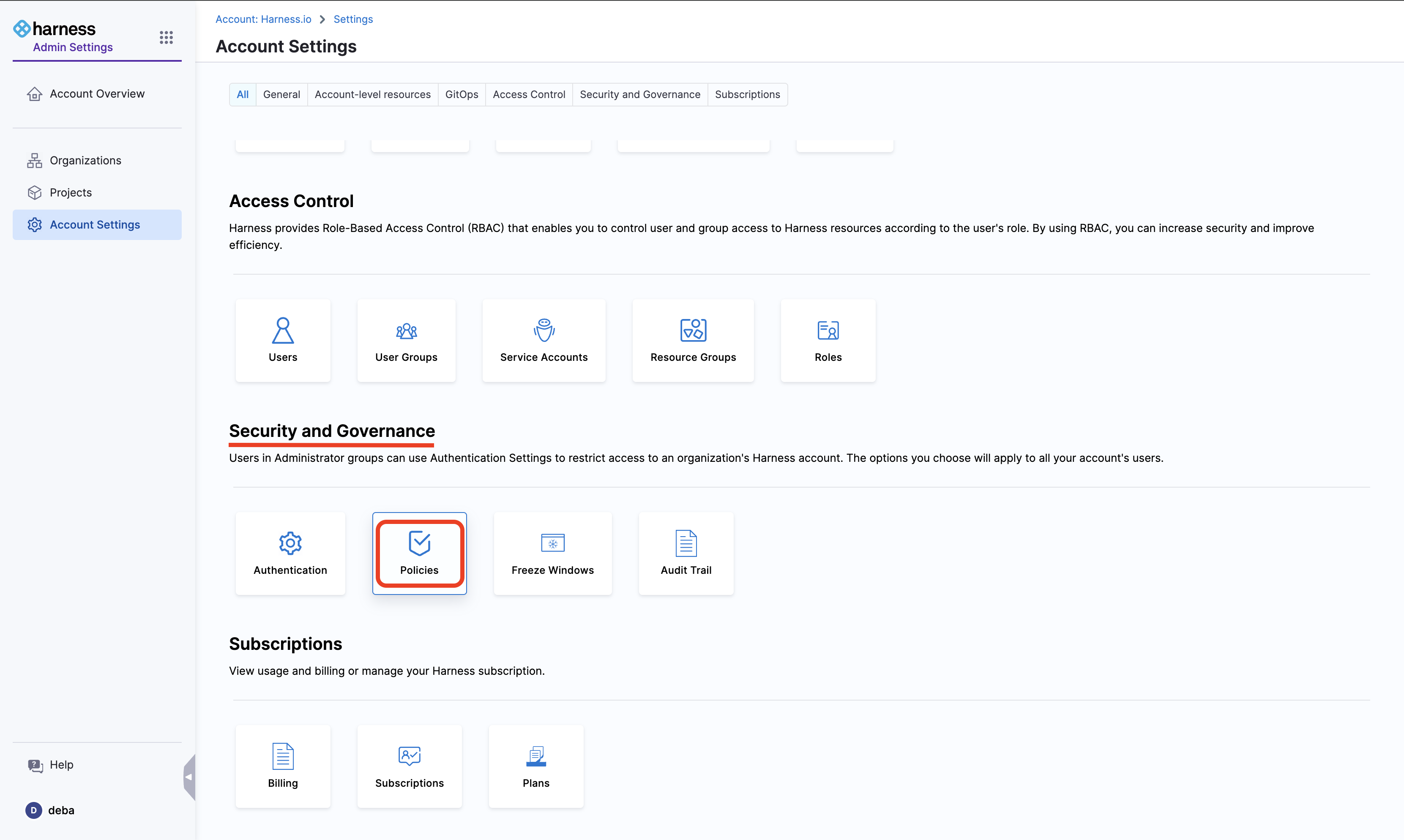 - Select Policies under Security and Governance.