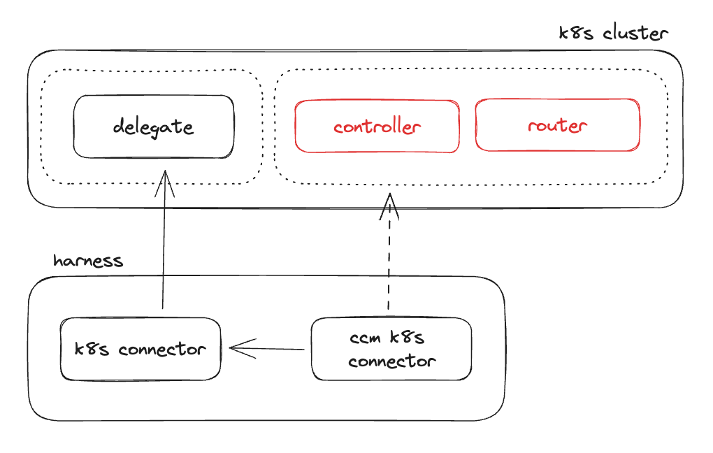 When enabling CCM for a cluster the first step is to deploy a delegate into the target cluster and give it a certain level of access (described later in this guide) depending on what you want to achieve with the Kubernetes connection. By deploying a delegate directly into the cluster you do not have to manage secrets, but simply control the access Harness has in your cluster by modifying the Kubernetes service account that is bound to the delegate deployment.