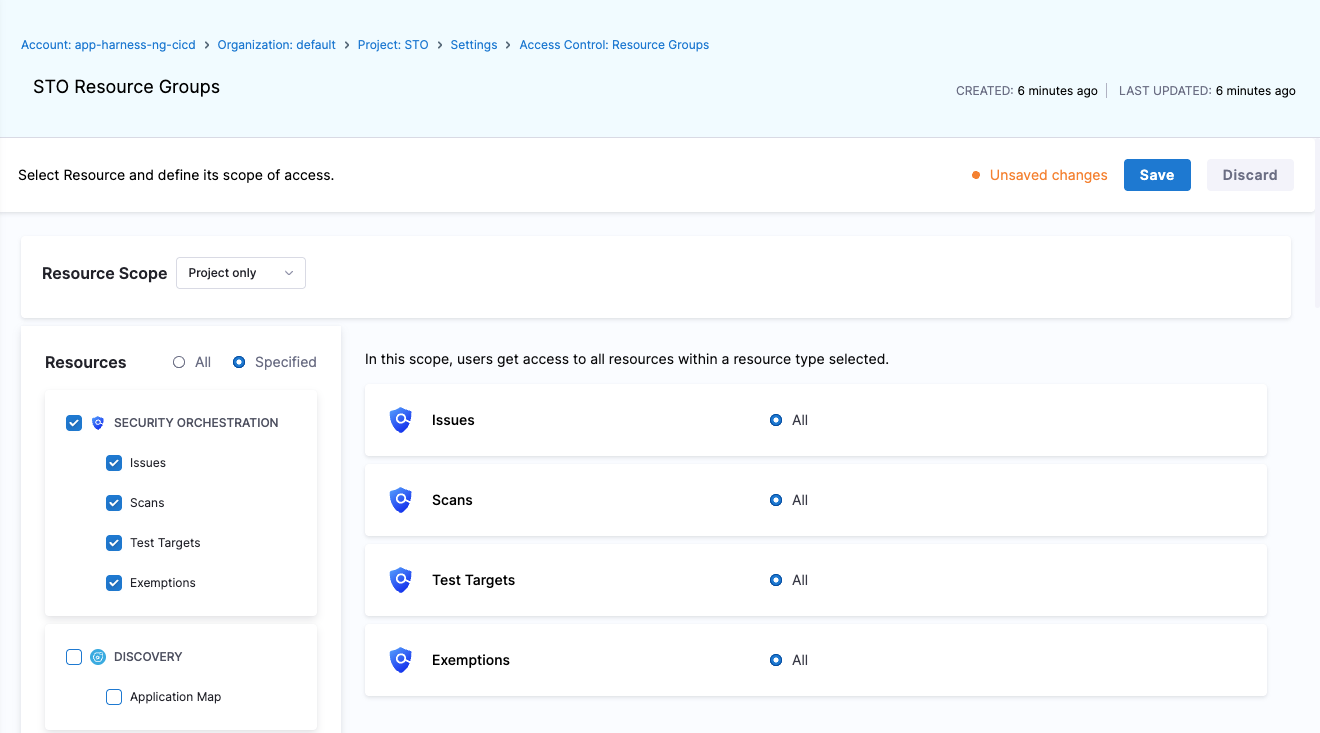 Added support for Harness Resource Groups at the Project, Org, and Account scopes. See the STO RBAC documentation and video on configuring STO RBAC for details (STO-9217).